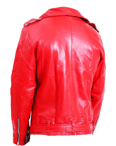 Introducing a striking Mens jacket in a bold red color, meticulously crafted from genuine leather. This jacket exudes confidence and a sense of adventure. The front showcases a sleek zipper closure, adding a touch of modernity to its design. The polyester lining internally ensures a comfortable and smooth feel against the skin.