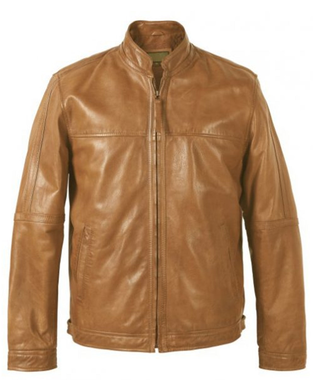 The Biker Tan Leather jacket comes with a stand-up collar and long sleeves. This fashionable leather jacket closes with a zip. Slash pockets with zip ensure a casual look.The material is 100% leather, back length approx. 27 ins. Specialist leather cleaning is recommended for the jacket.