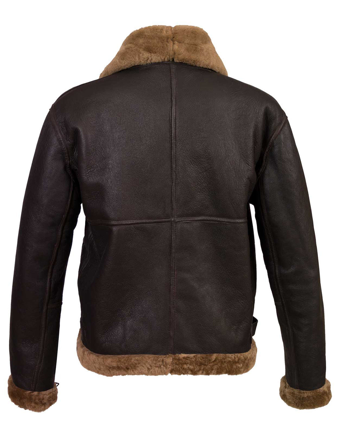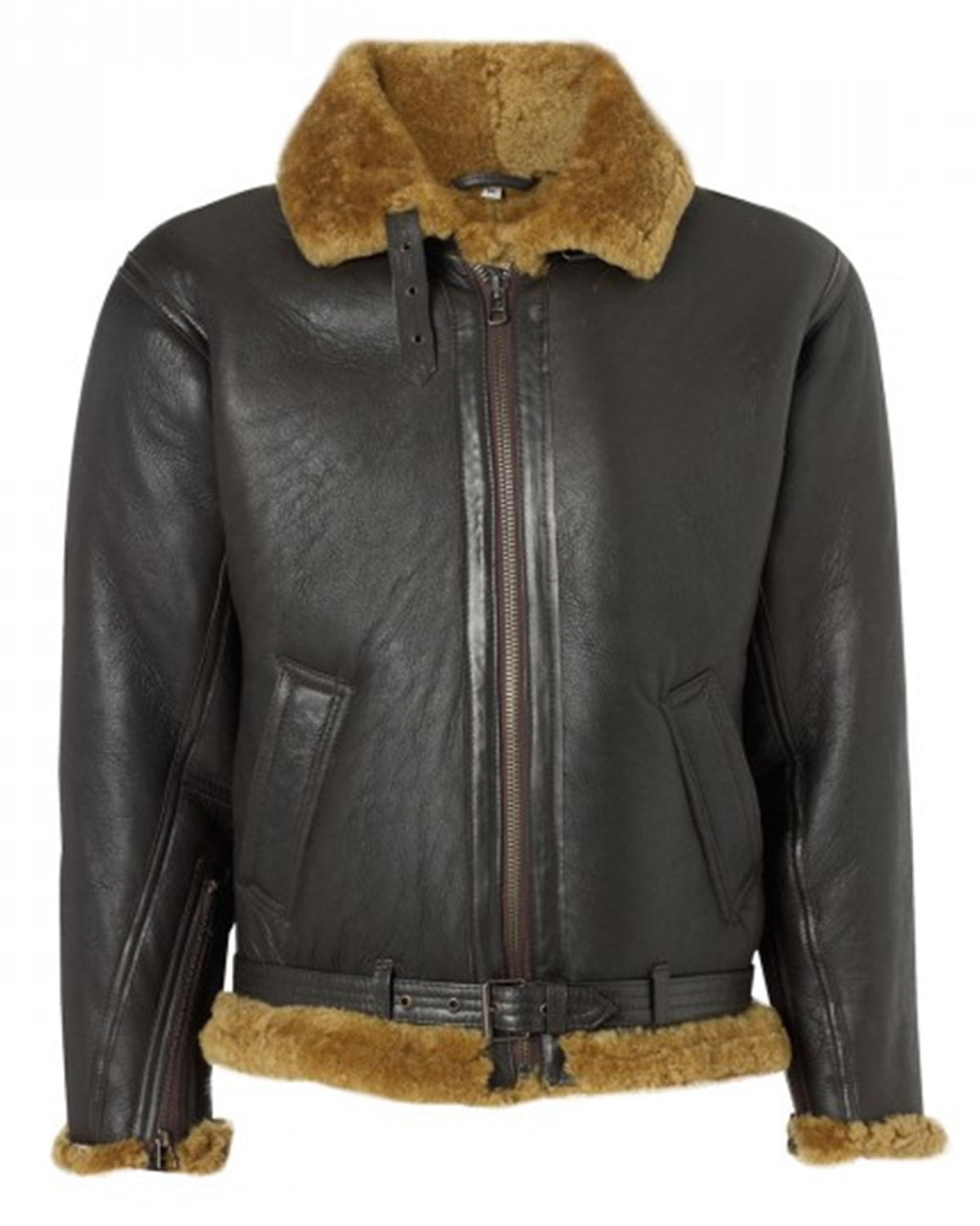 This timeless style is dark brown on the exterior and camel coloured wool inside, at the base, and on the cuffs. It is made entirely of the same soft and supple sheepskin that was used to make the first Sheepskin Flying Jacket Whether you're standing at a football game or soaring through the air, the thick wool pile will keep you toasty, heavy duty brass zips on the front, cuffs and Adjustable buckle fasten belt on the waist with Buckle fastening strap on collar.Leather gusset on armpits for easy movement is also given.