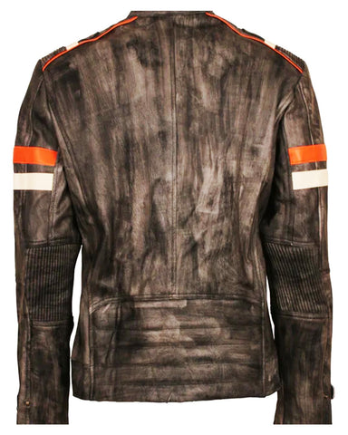 Multicolored stripes on the shoulders and sleeves make up the unique design element, which livens up the overall appearance. This jacket's distressed finish, which is both stylish and fashionable, perfectly complements the iconic cafe racer design.