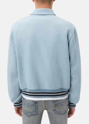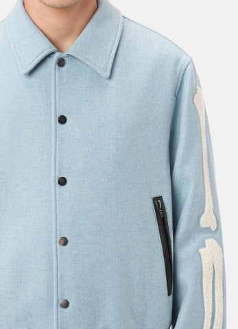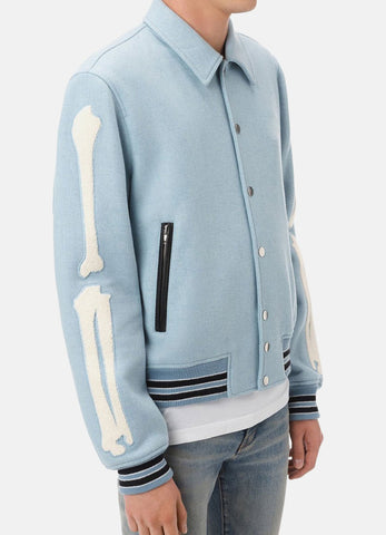 In a charming baby blue hue, this varsity jacket features a unique bone design detailing, setting it apart from the rest. The shirt-style collar adds a touch of casual elegance, making it a perfect choice for fashion-conscious men.