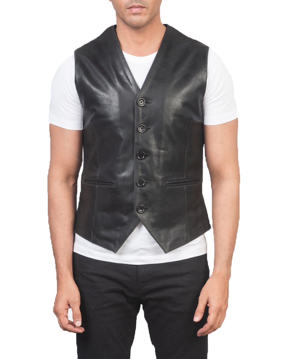 Mens Distressed Genuine Sheepskin Leather Vest - Black / XS