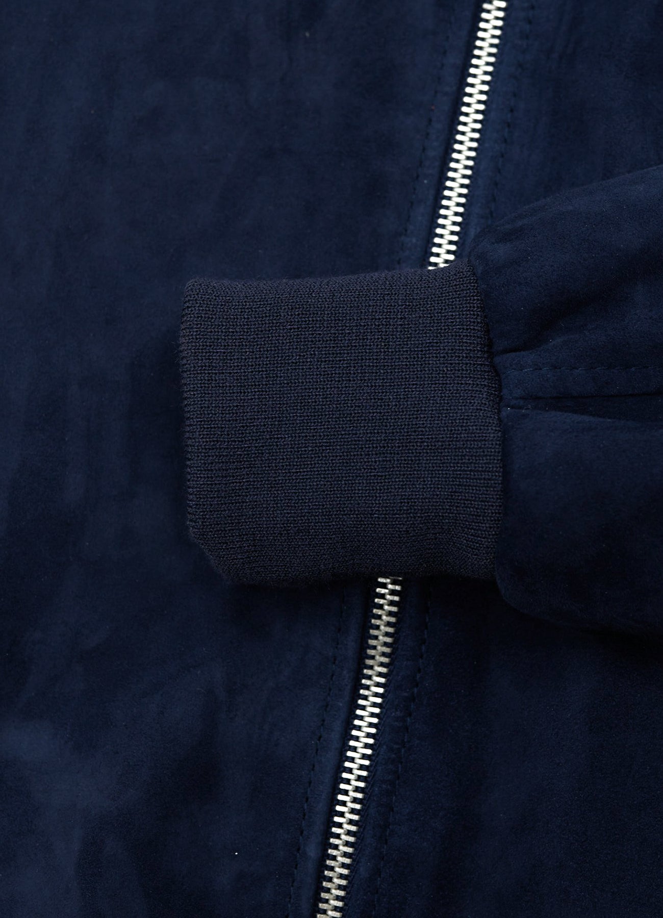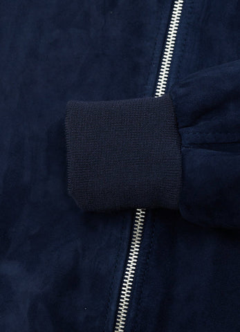 The rich midnight blue hue exudes charisma, making a statement wherever you go. The stand-up collar adds an element of sleekness, while rib-knit cuffs on the sleeves provide a snug fit. The zipper front ensures effortless wear, embodying a perfect blend of comfort and style.