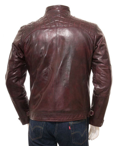 Mens Oxblood Quilted Shoulder Cafe Racer Biker Real Leather Jacket - Oxblood / S