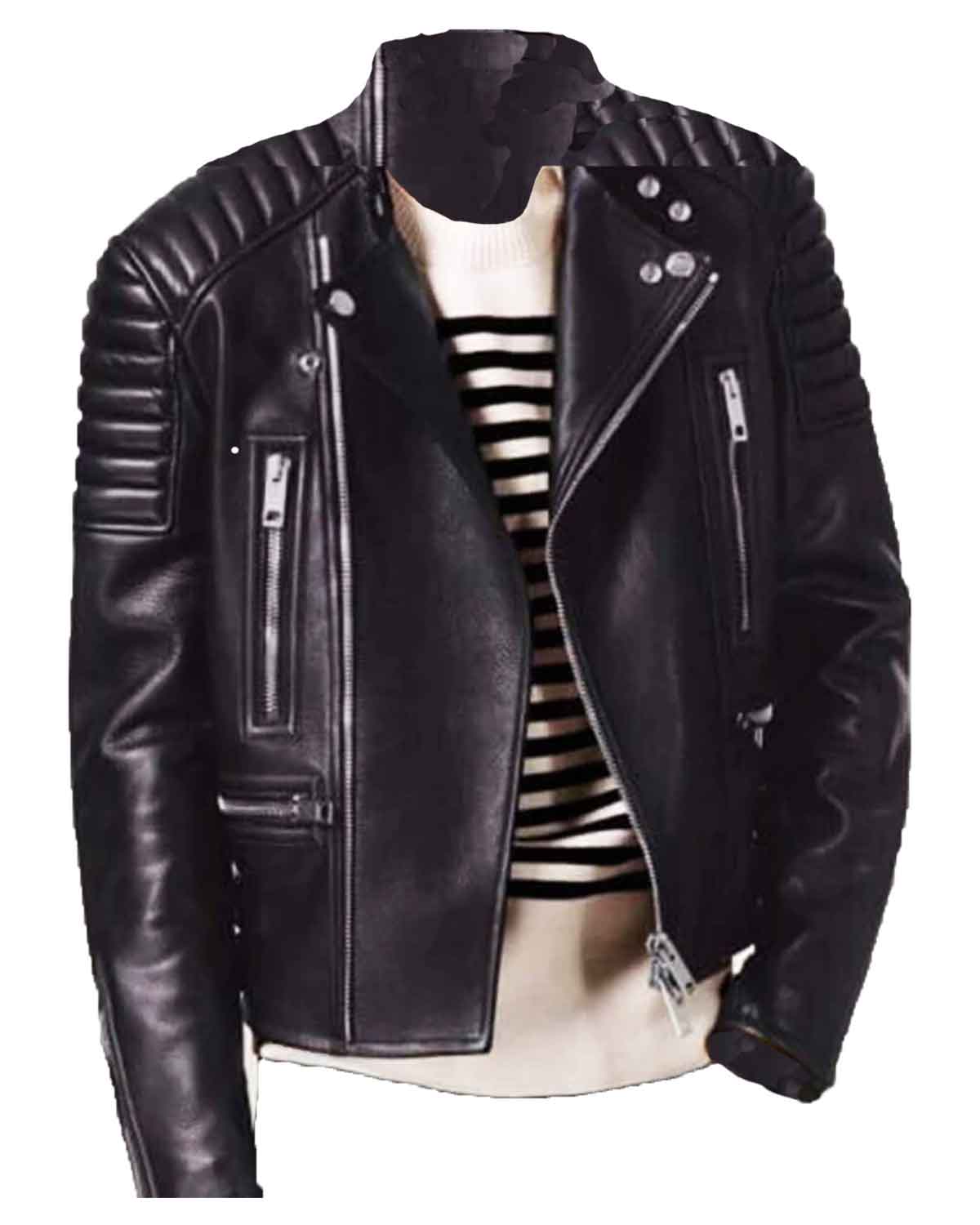 Elevate your biker style with the Mens Padded Shoulders Asymmetrical Black Bikers Padded Jacket. Crafted from real leather, this jacket not only adds a rugged edge to your look but also guarantees durability. The asymmetrical zipper closure at the front adds a modern and dynamic touch, setting you apart in the world of biker fashion.