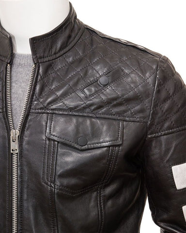 Designed for practicality and flair, it features two chest pressed stud pockets and two side leather zip pockets, offering ample storage for your essentials. The stand collar completes the look, making this Black Leather Jacket a versatile statement piece for the modern man, exuding confidence and style.