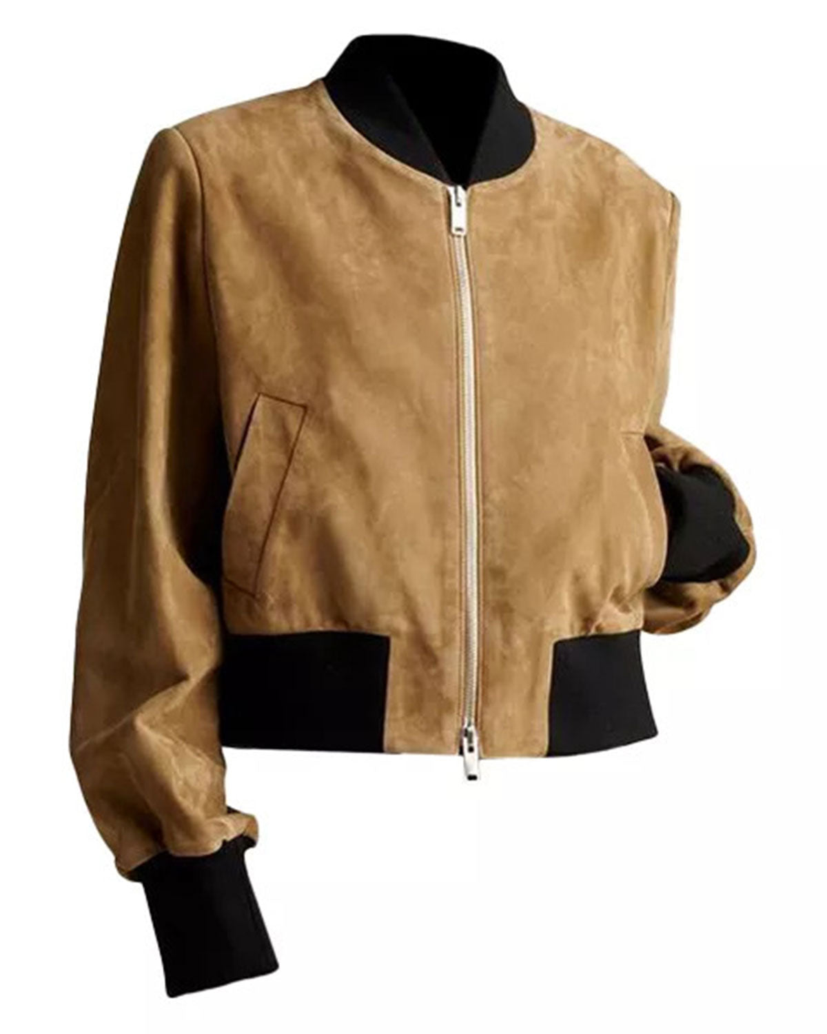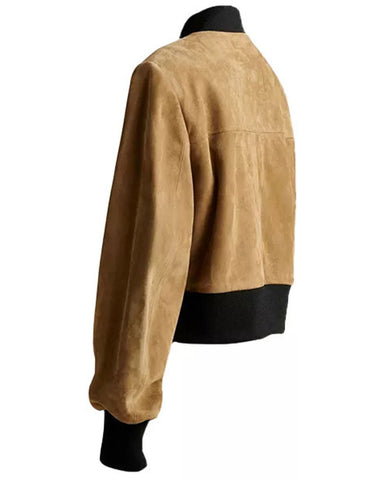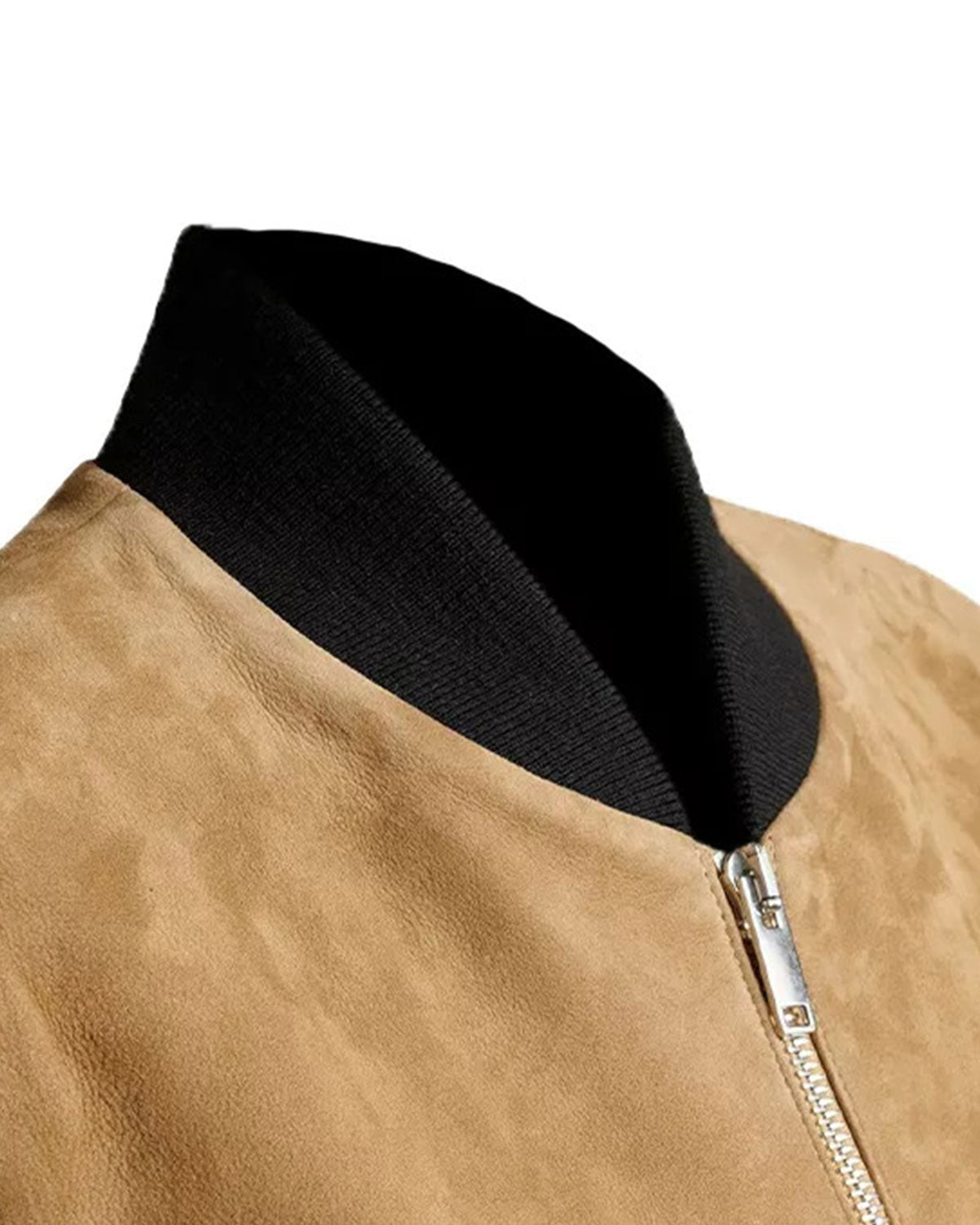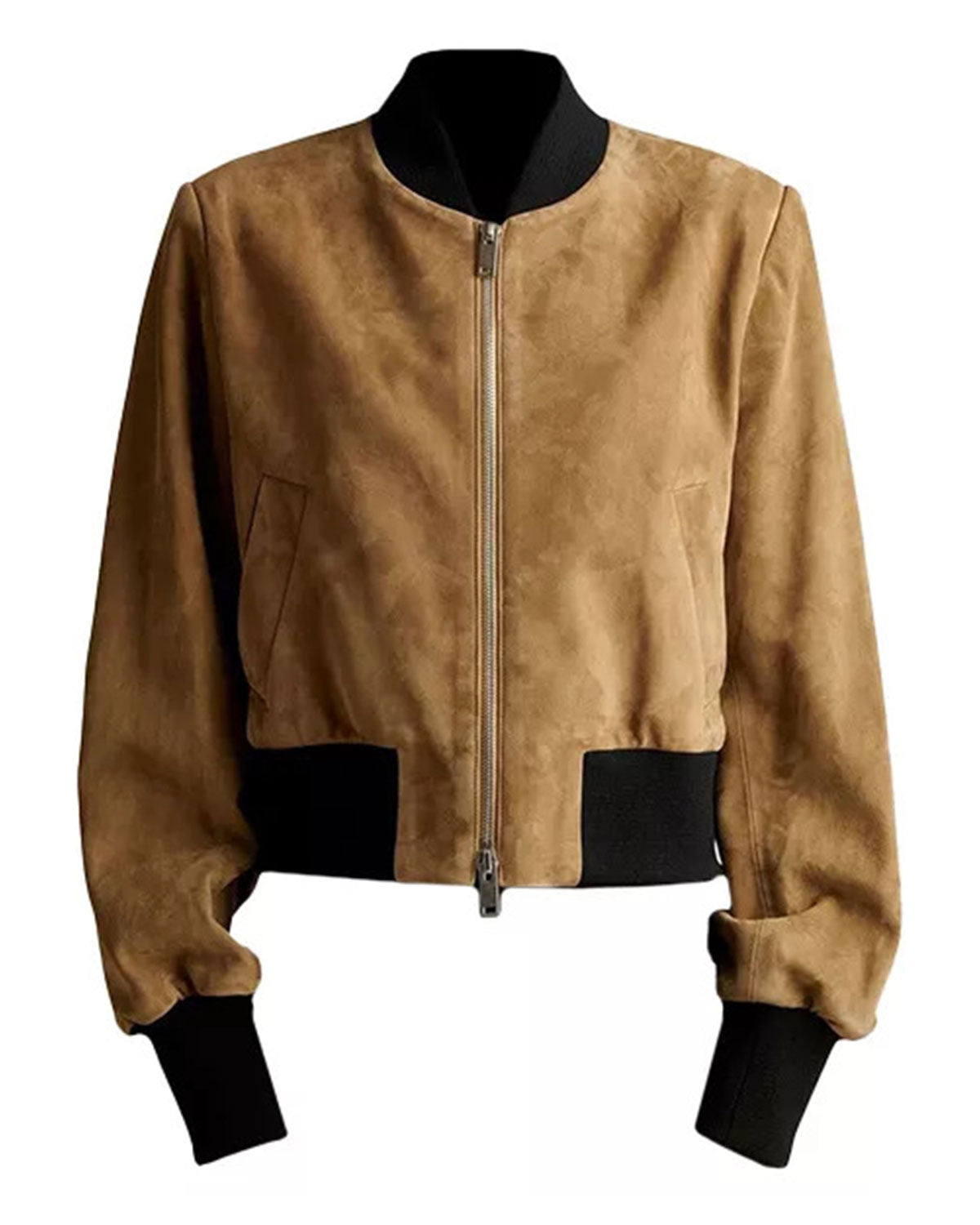 This jacket's stand-up collar and understated shoulder pads seamlessly blend modern style with classic components. In addition to offering a modern touch, the front two-way zip closure provides a multitude of styling alternatives. This Suede Bomber Jacket for Women can be worn completely zip-closed or partially open, depending on your preferred look and two side welt pockets combine design and practicality to provide convenience and a sleek appearance.