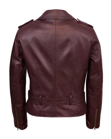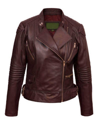 The full zip closure cuffs on the sleeves provide an adjustable fit, and the premium-quality stitching ensures durability and complexity. Elevate your wardrobe with the Womens Biker Burgundy Leather Jacket—a versatile choice that effortlessly combines bold elegance with timeless style.