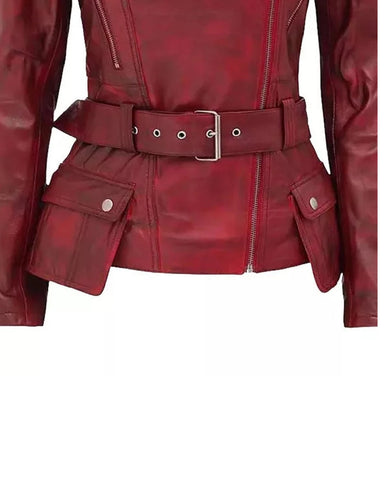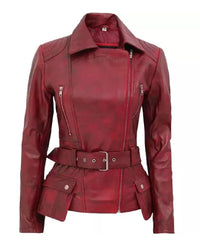 The internal viscose lining ensures a comfortable fit, while the inclusion of a waist belt adjustment and shoulder panels adds a fashionable element to the overall design. With the convenience of two outer zipper pockets and an internal pocket, this jacket seamlessly combines practicality with a sleek and polished aesthetic. Enhance your style with this women maroon waist belted leather jacket, meticulously crafted to prioritize both fashion and comfort.