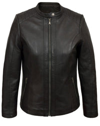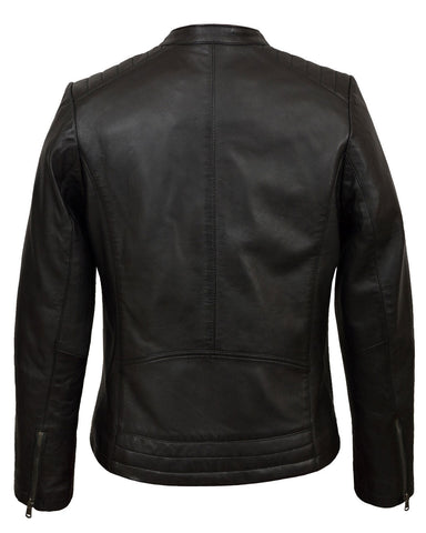 Presenting the WoMens Black Leather Biker Jacket which is a sleek and stylish choice for the modern woman. This jacket features a stud-fasten stand-up mandarin collar, adding a touch of edginess to the classic design. Two easy-access zip front pockets provide both style and practicality, while stitch details on the shoulders and back enhance the jacket's overall appeal.