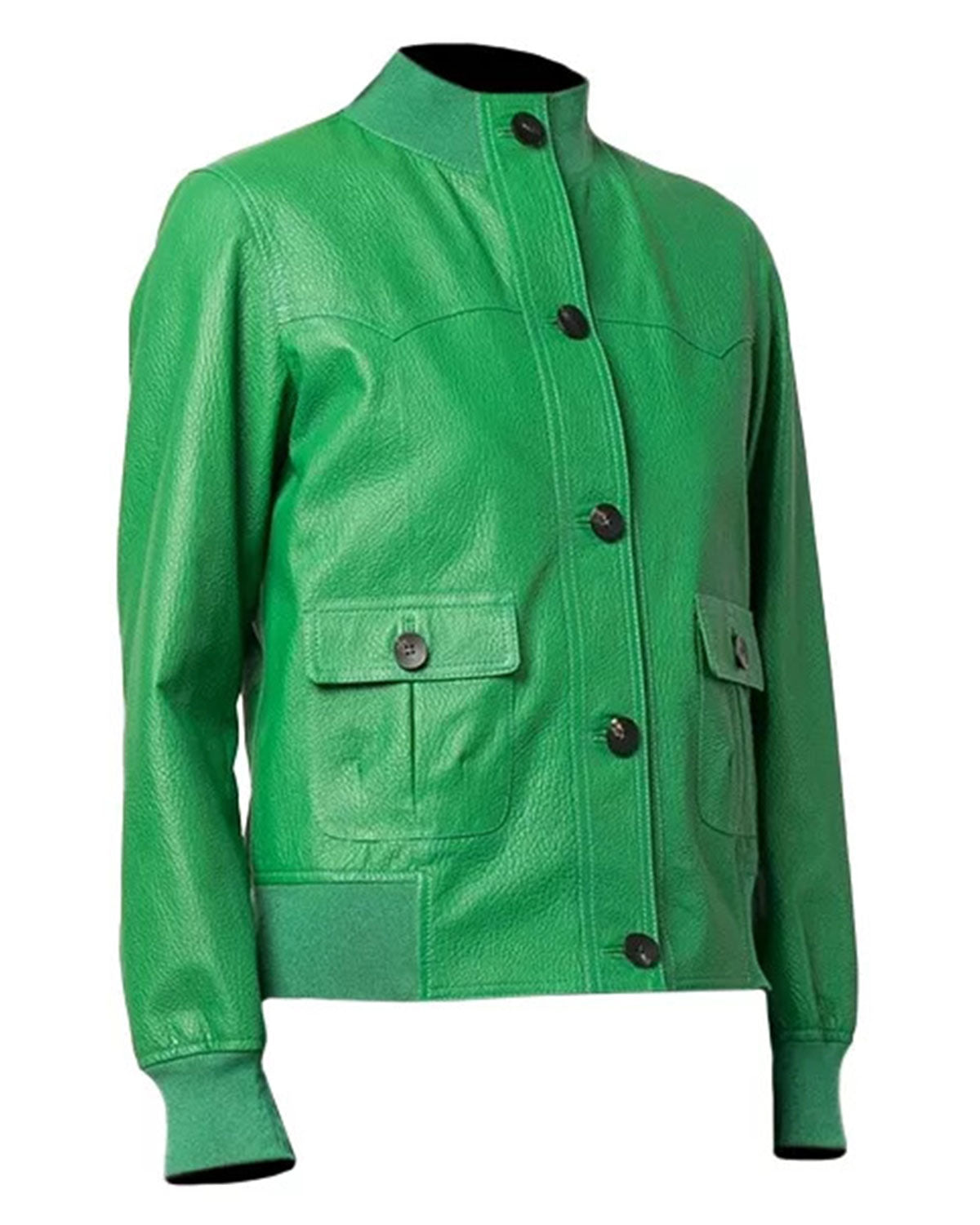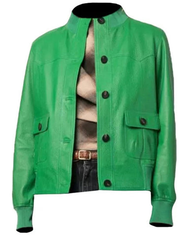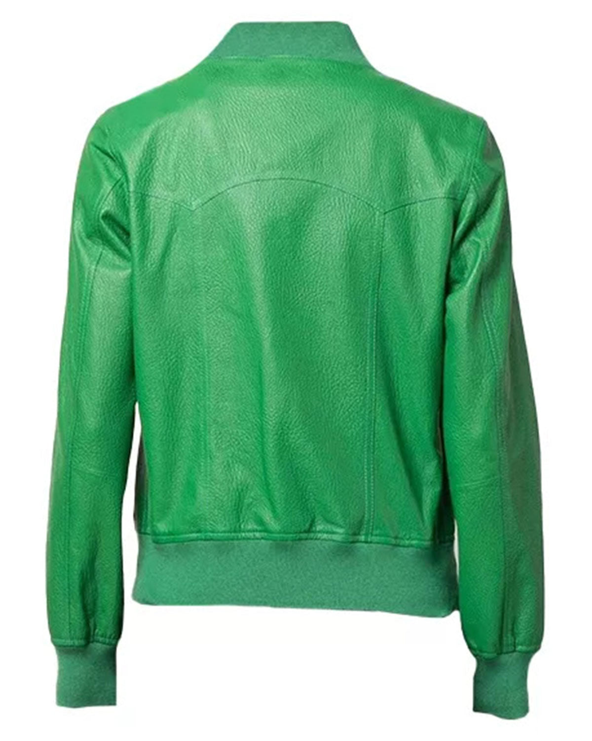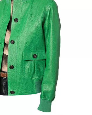 The ribbed hem and cuffs finish the outfit by adding a contemporary touch and guaranteeing a comfortable fit. This eye-catching green leather jacket for women will add flair to your outfit while deftly blending fashion and function.