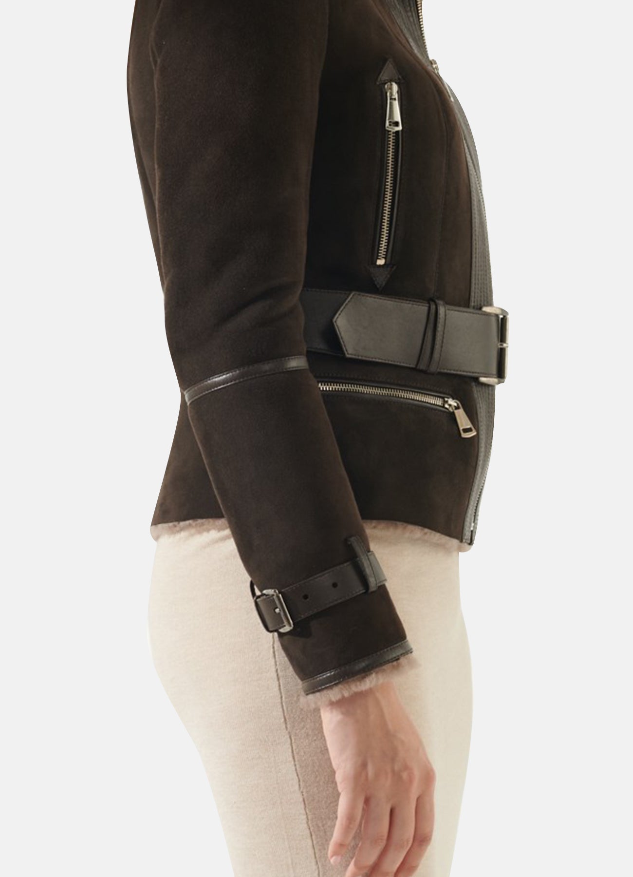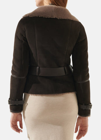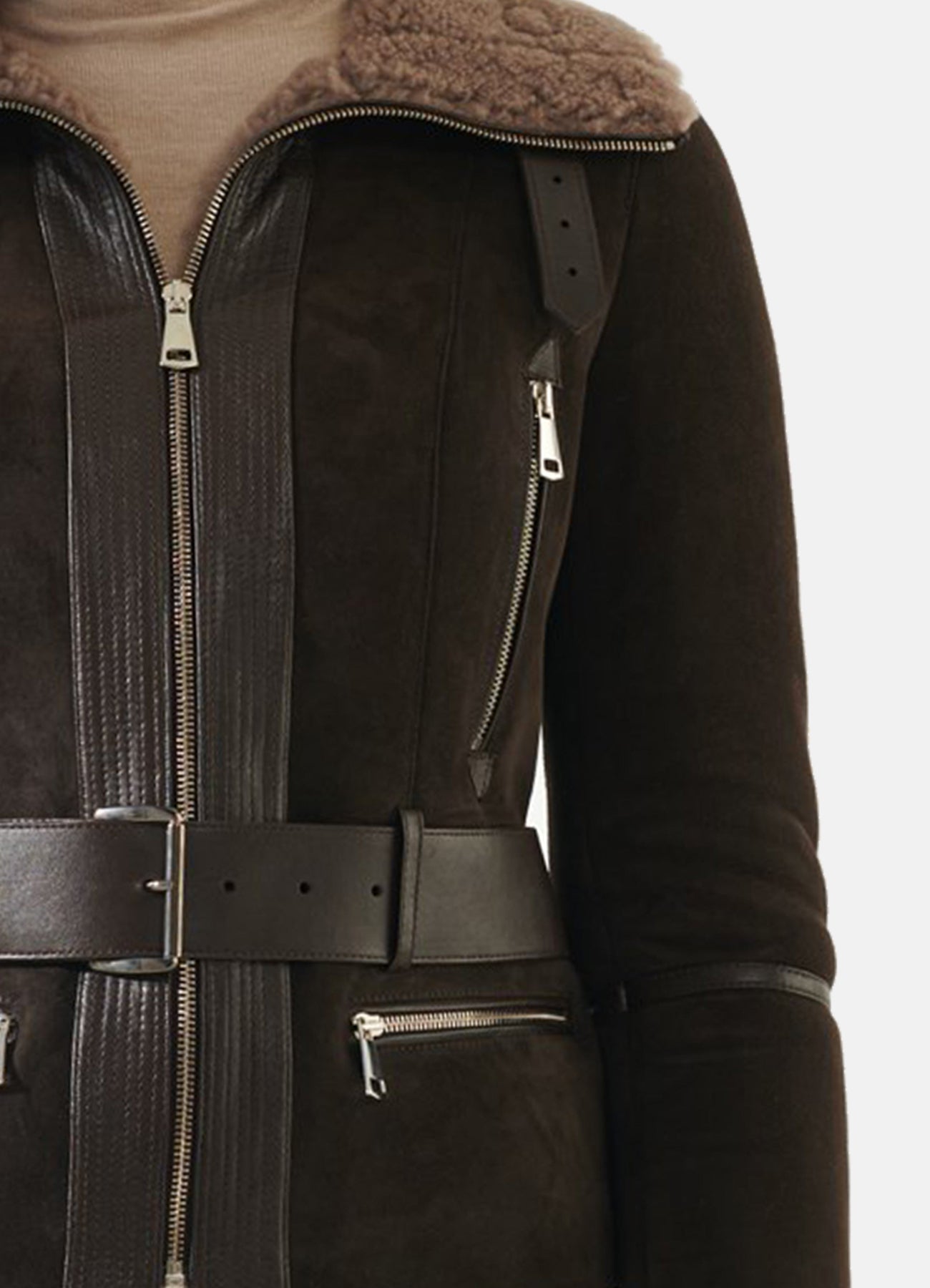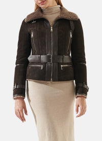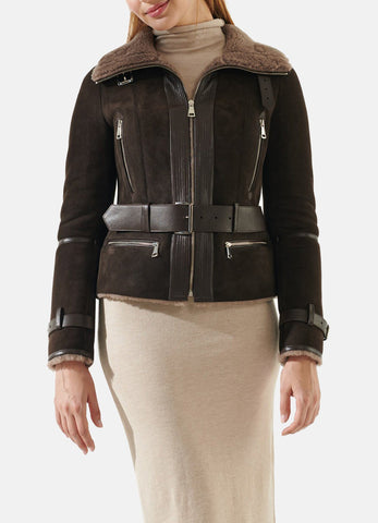 In a rich dark brown hue, this shearling jacket seamlessly merges classic and contemporary design elements. The fur collar exudes luxury, while the belt and zipper front closure enhance both style and comfort.