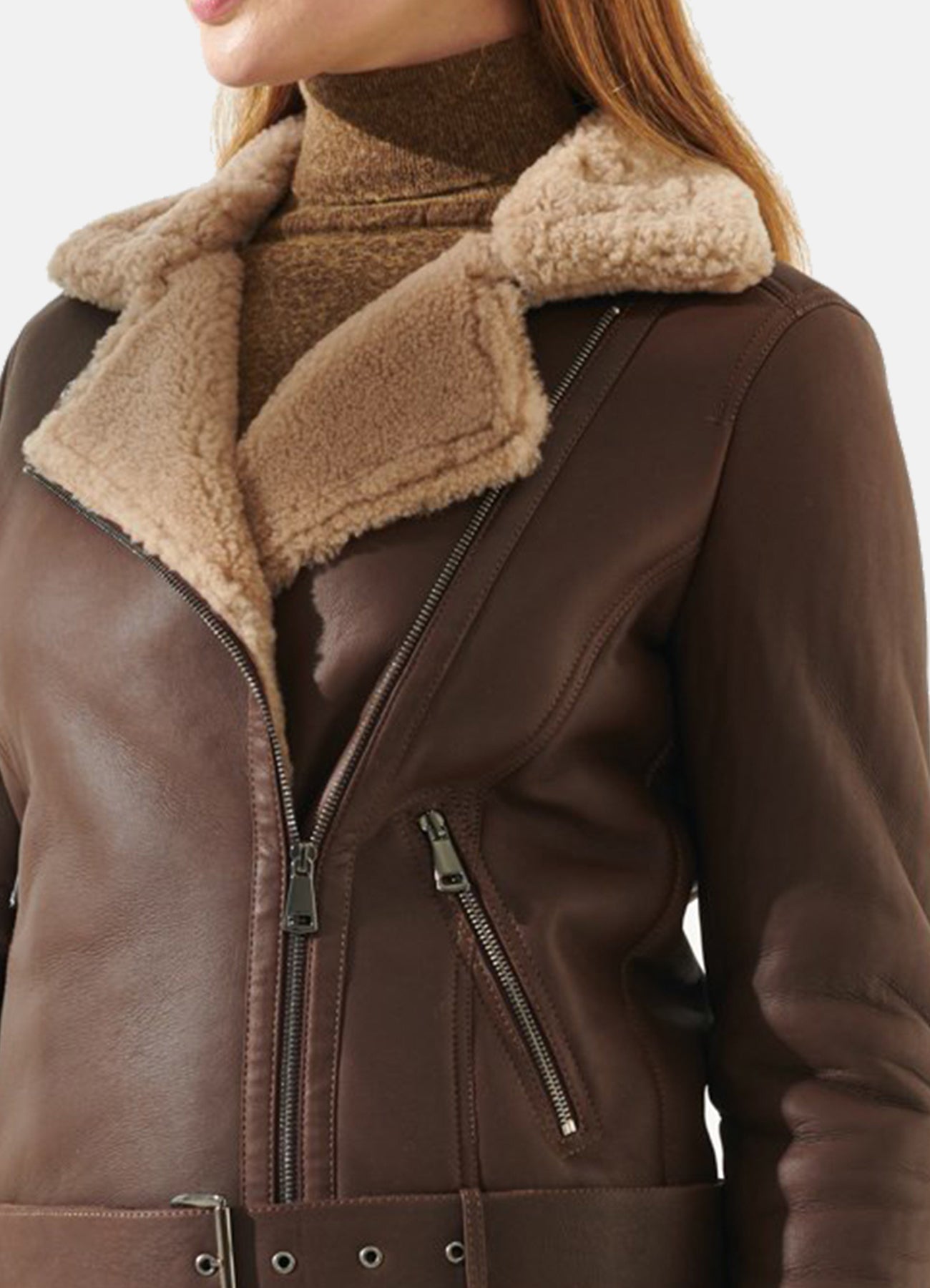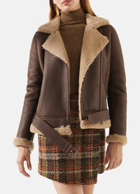 With fur and zipper cuffs on the sleeves, this jacket offers an extra layer of comfort and versatility. Whether you're strolling through the city or embracing the great outdoors, the WoMens Chocolate Brown Shearling Leather Jacket effortlessly combines fashion and function. Redefine your winter wardrobe with this exceptional piece, where luxury meets practicality in every stitch.