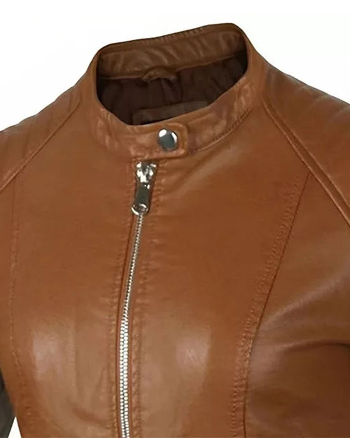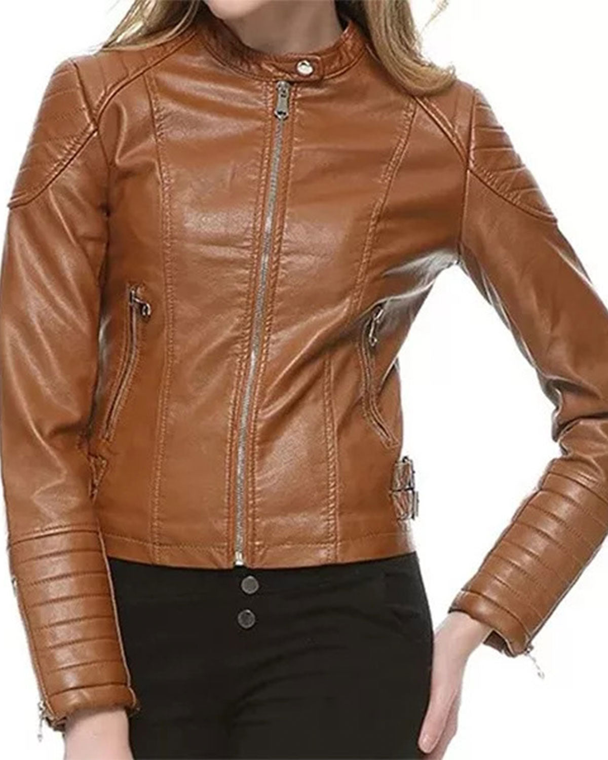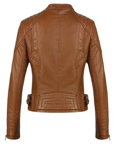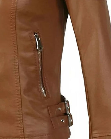 Presenting a casual and effortlessly trendy option: the WoMens Brown Motorcycle Leather Jacket. This jacket is made of rich brown faux leather and has a useful zip closure for ease of use. A touch of competence is added by the Mandarin Chinese collar, and traditional coverage is provided by the full sleeves.