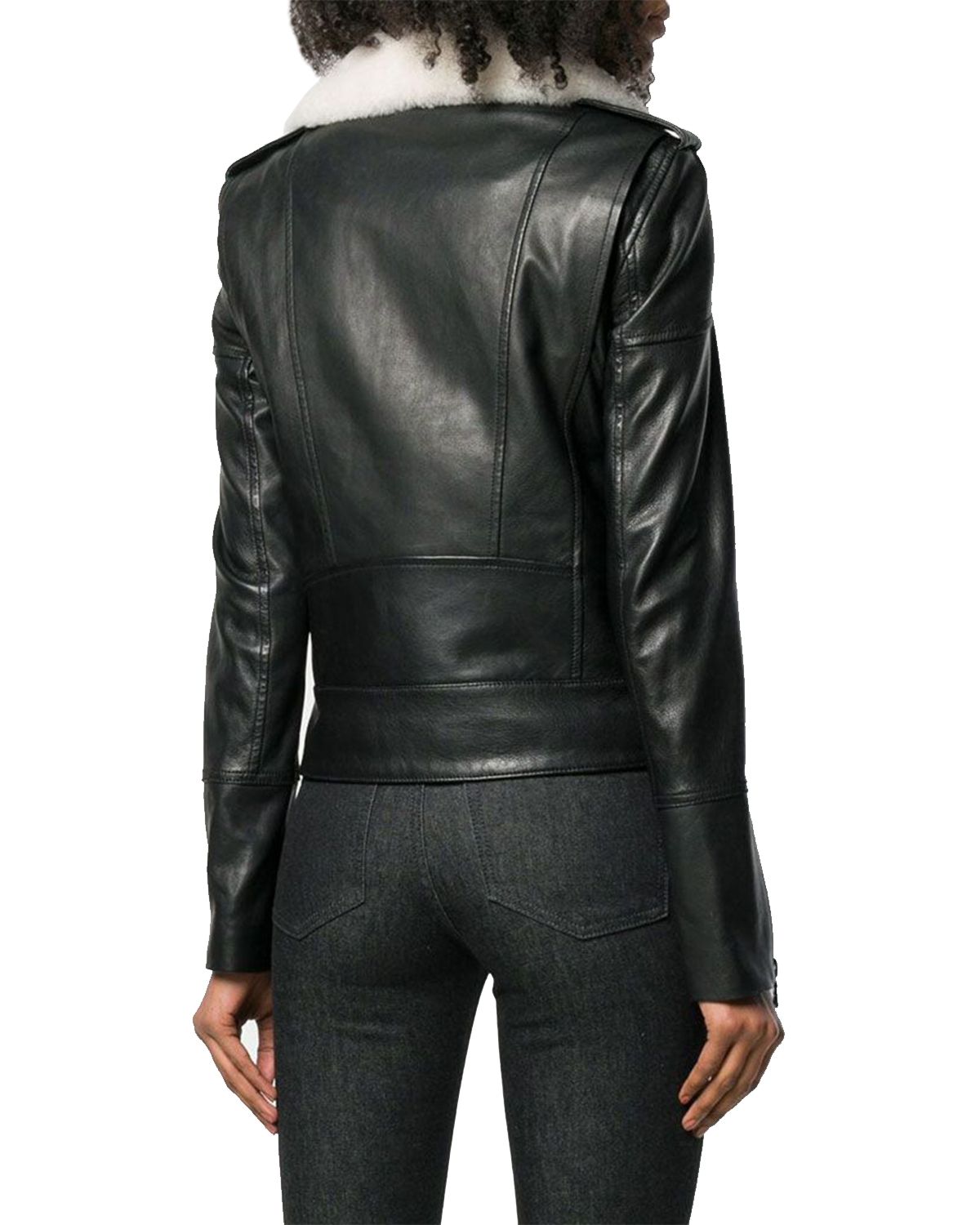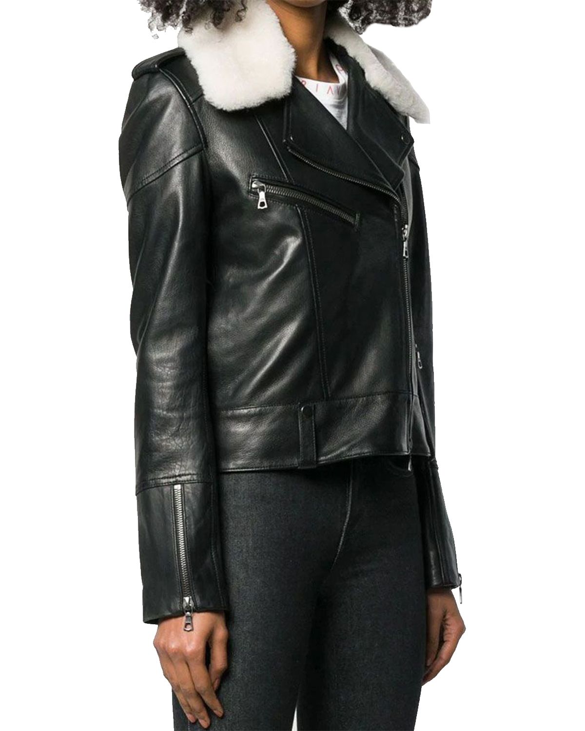 Womens Fur Collar Black Aviator Biker Style Leather Jacket Sale