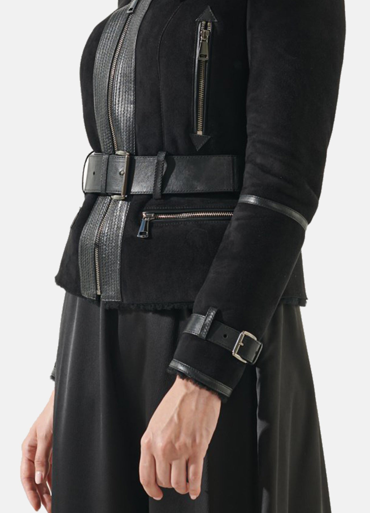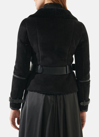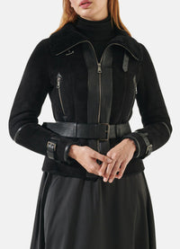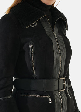Womens Jet Black Suede Shearling Leather Jacket Sale