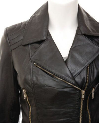 Womens Long Black Biker Real Sheepskin Leather Jacket - Black / XS