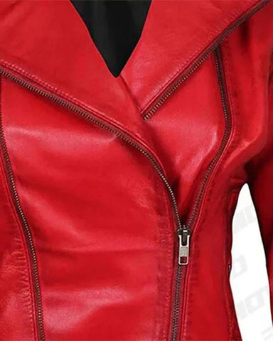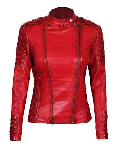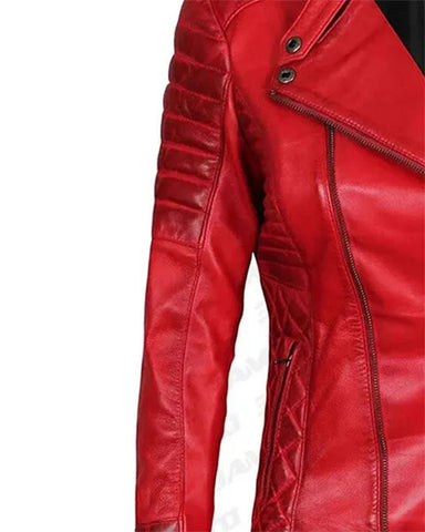 For motorcycle enthusiasts, this asymmetrical red lambskin leather jacket is the perfect choice. Crafted with high-quality fabrics, original hardware, and practical pockets, it combines strength and durability with a practical and stylish design. Gear up for your next ride with this red quilted leather jacket for women and enjoy fantastic discounts in our ongoing winter sale. Be sure to consult the size guide before making your online purchase.