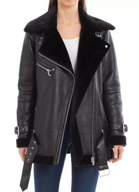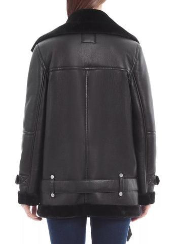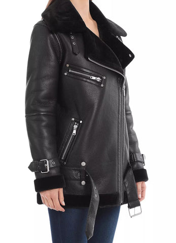 Womens hine Black Shearling Leather Jacket - X-Small / Black